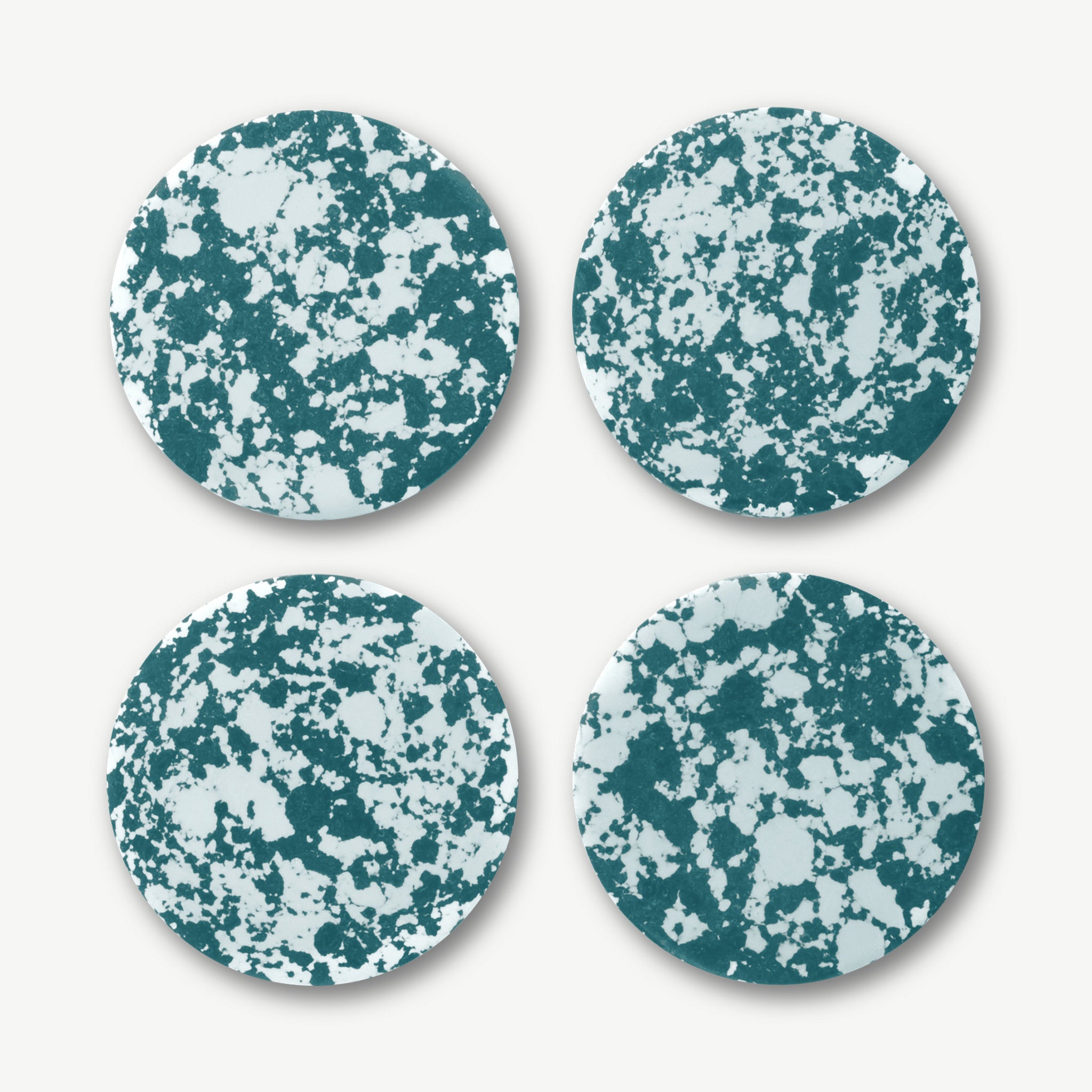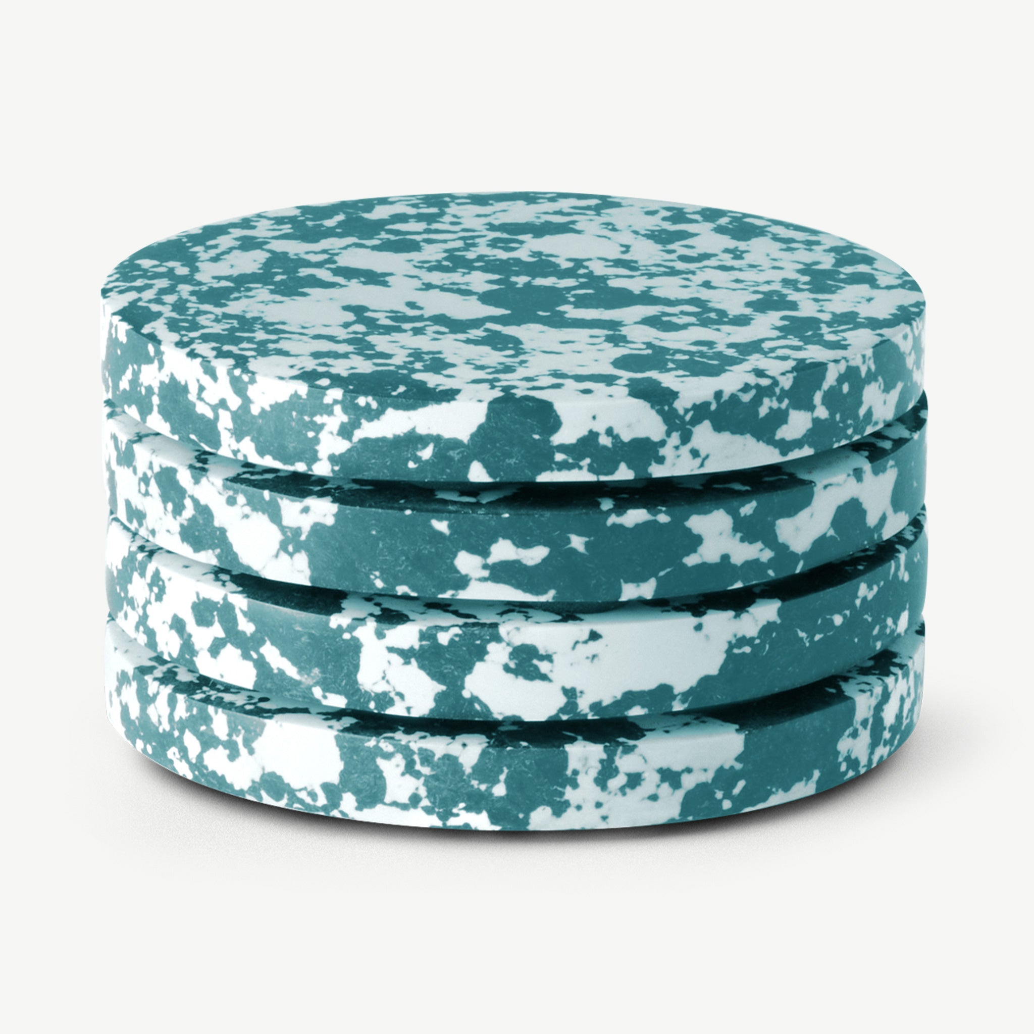 Expertly crafted by local artisans in India, these sustainable coasters are produced using an innovative process that repurposes powdered marble residue, blended with high-quality pigments. Each set of four coasters features unique, one-of-a-kind green and white patterns, offering a blend of artistry and function. Designed to protect surfaces while adding a stylish touch, these coasters are durable, perfect for enhancing any table setting.